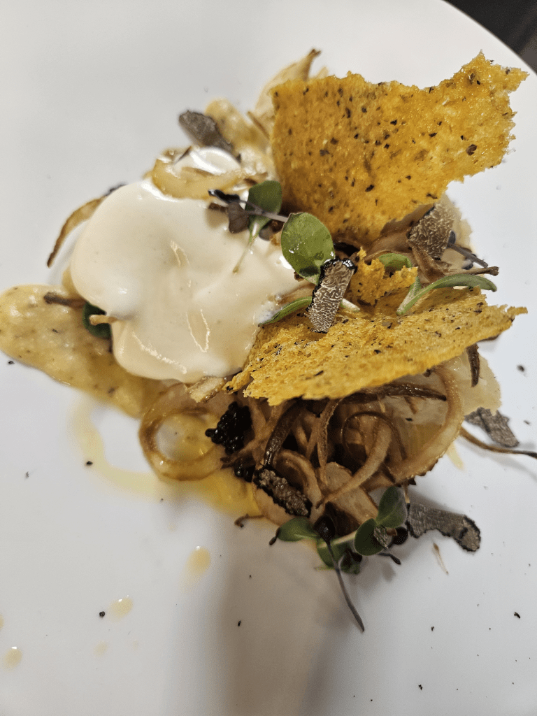 Piatto valsesiano tipico delle popolazioni walser, piatto forte della mamma. Lei lo prepara come una grossa frittata di patate, polenta, cipolle e toma. Io lo vedo così: crema di polenta, salsa di cipolle alla brace, millefoglie di patate, quenelles di purea arrostita, spuma di toma, chips di polenta e di cipolle e una spruzzata di tartufo nero.
