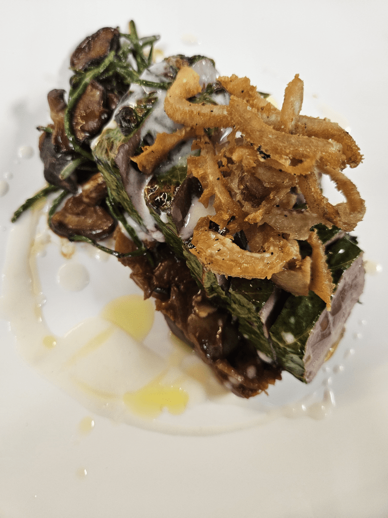 Marinato allo zenzero e soia, caponata siciliana, trippa croccante e salsa bisque al carbone vegetale. Il capunet è un altra leccornia di montagna, che preparava la zia Irma nelle braci del focolare in alpeggio. Un involtino di foglie di “lavasse”, il rabarbaro selvatico, ripieno di tutto quello che c’era disponibile.