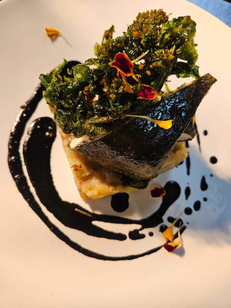 Dish that contains all the “valsesianità”: a roulade of coalfish marinated in the “saleggia”, the mountain thyme. Wrapped in a sheet of nori seaweed and scalded in alpine butter, served with “patati masarai”, turnip tops chips and squid sauce.